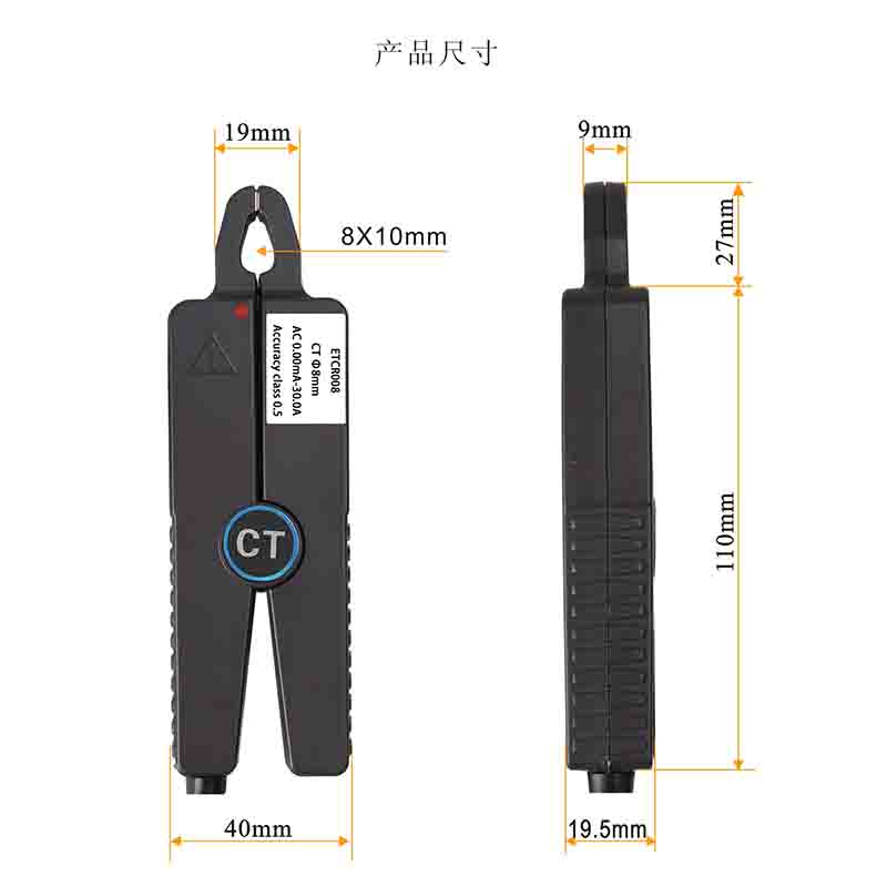 ETCR008 | ![]() | 量程:0.00mA~30A AC 精度等級:0.5 相位誤差:≤2° 變比:2500:1 工作頻率:10Hz~100kHz | 0~300mA≤300Ω 0~3A≤30Ω 0~30A≤3Ω | Ф8mm | 137mm×40mm×19.5mm | 175g |