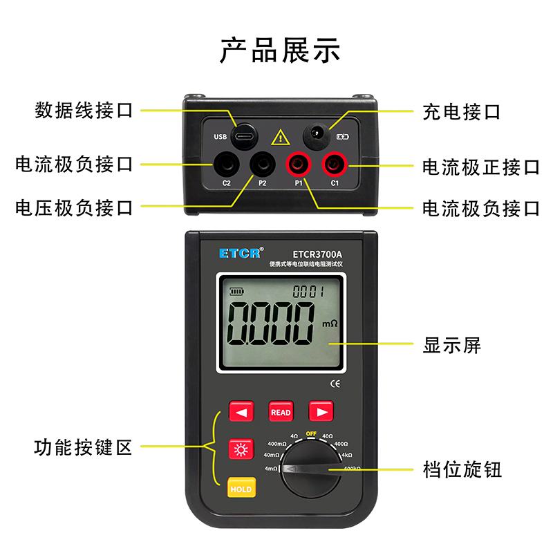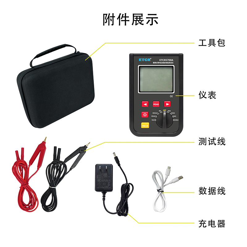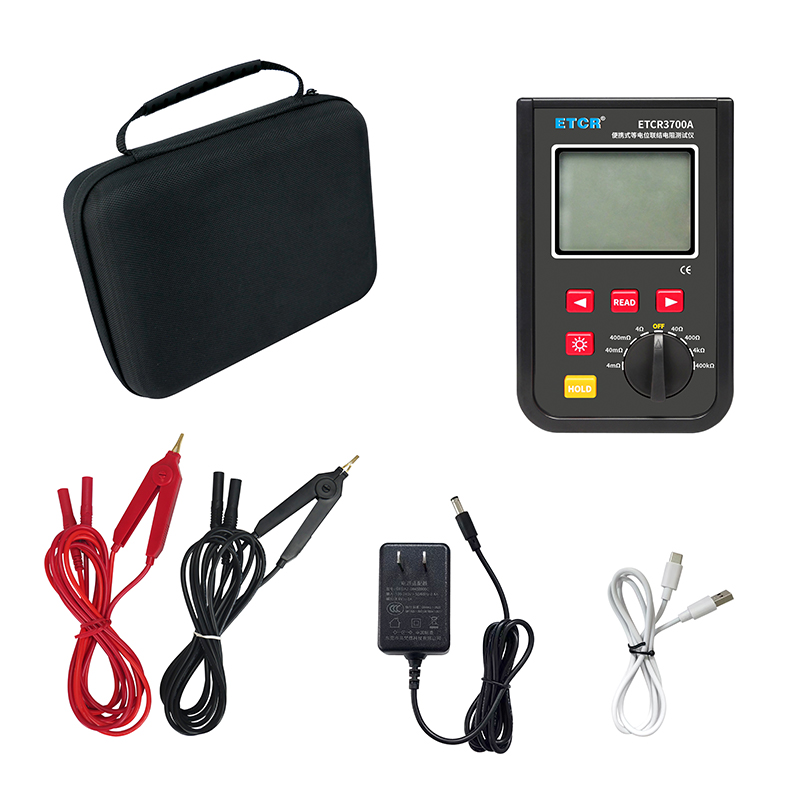 | ETCR3700A便攜式等電位聯(lián)結電阻測試儀 | 0.001mΩ~40.0kΩ | 4mΩ、40mΩ、400mΩ、4Ω、40Ω、400Ω、4kΩ、400kΩ | 1.2A MAX | —— | 9999組 | 藍牙、USB |