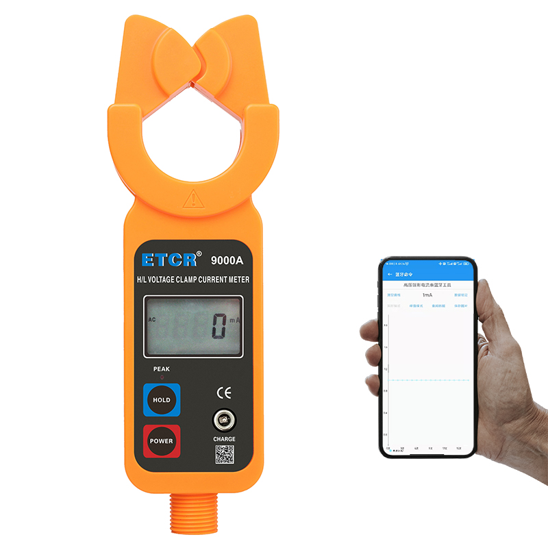 ETCR9000A藍牙版高低壓鉗形電流表鉗頭與引導區創新的一體化設計,通過按壓或退拔絕緣桿能快速方便鉗夾或撤離被測導線,安全快捷。儀表還具有峰值保持、數據保持、數據存儲、藍牙通訊等功能。